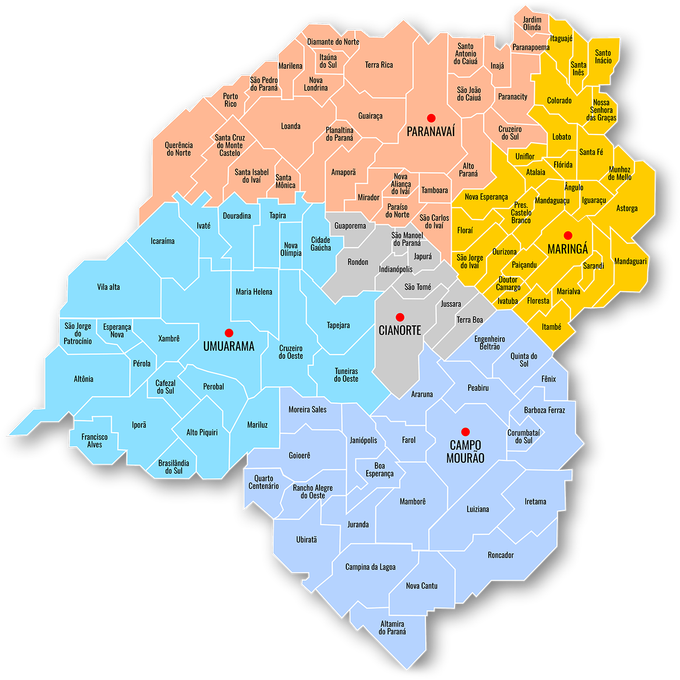 Alto Paraná, Amaporã, Colorado, Cruzeiro do Sul, Diamante do Norte, Floraí, Guairaçá, Inajá, Itaguajé, Itaúna do Sul, Jardim Olinda, Loanda, Marilena, Mirador, Nova Aliança do Ivaí, Nova Esperança, Nova Londrina, Paraíso do Norte, Paranacity, Paranapoema, Planaltina do Paraná, Porto Rico, Porto São José, Presidente Castelo Branco, Querência do Norte, Santa Cruz do Monte Castelo, Santa Inês, Santa Isabel do Ivaí, Santa Mônica, Santo Antônio do Caiuá, Santo Inácio, São Carlos do Ivaí, São João do Caiuá, São Pedro do Paraná, Tamboara, Terra Rica, Uniflor.